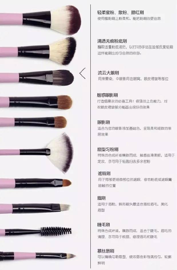 化妝刷是我們常用的化妝工具,尤其是彩妝使用化妝刷才能夠化出即快速又好看的妝,但是由于化妝刷套裝的模樣大同小異,只不過是形狀和大小有小小區別,對于新手來說區分化妝的用途簡直是噩夢。那么怎樣才能記住化妝刷的用途呢,下面小編為大家詳細介紹一下。